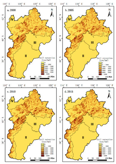 Soil retention service in (a) 2000, (b) 2005, (c) 2010 and (d) 2015.