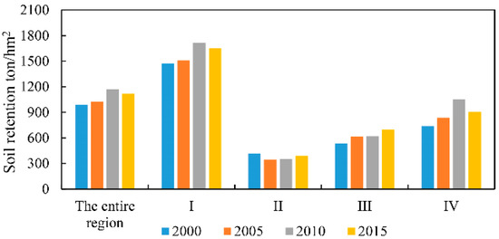 Sediment retention had high spatial distribution patterns in Zones I and IV, where the topography was mainly mountain and land coverage was mainly forest and grass. The low value was in Zones II and III, where plain was the main landform (Figure 5). The sediment erosion of the entire region increased from 990.07 ton/hm2 in 2000 to 1119.53 ton/hm2 in 2015 with a slight decline in 2015 (Figure 6). Zoning in the ecological–functional Zones I and IV had a similar increasing tendency as the entire region and peaked in 2010 (1714.97 ton/hm2 in Zone I and 1052.17 ton/hm2 in Zone IV). The soil retention in Zone II decreased and then increased and it reached a historical low in 2005. The only zone whose soil retention steadily increase from beginning to end was Zone III (from 534.19 ton/hm2 in 2000 to 698.93 ton/hm2 in 2015).