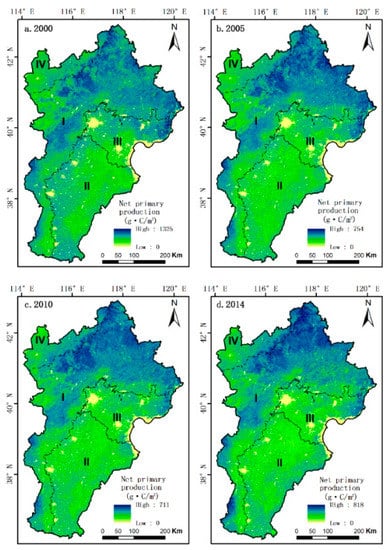 NPP in (a) 2000, (b) 2005, (c) 2010 and (d) 2015.