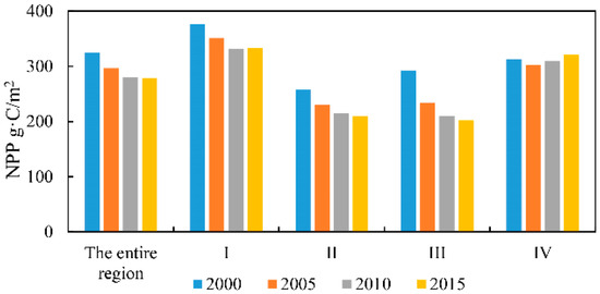 Annual average NPP in ecological–functional zones in 2000–2015.