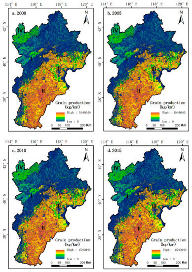 Grain productive capacity in (a) 2000, (b) 2005, (c) 2010 and (d) 2015.