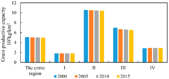 The average grain productive capacity of the entire region had a slight decrease from 5.09 × 105 kg/km2 in 2000 to 4.98 × 105 kg/km2 in 2015 (Figure 10), which indicated that the quality of farmland in the whole region had degraded. Meanwhile, the grain productive capacity of Zones I, II and III all experienced a decreasing trend, especially that of Zone III, which dropped by 6.58%. By contrast, the production capability of Zone IV had a slight increase of roughly 0.67%.