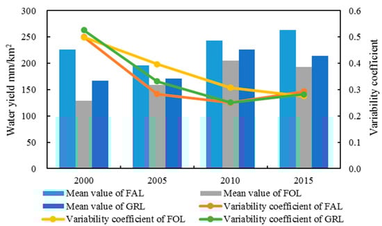 Mean value and variability coefficient of water yield in farmland (FAL), forestland (FOL) and grassland (GRL) in 2000–2015.