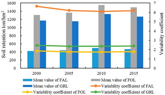 Mean value and variability coefficient of soil retention in FAL, FOL and GRL in 2000–2015.