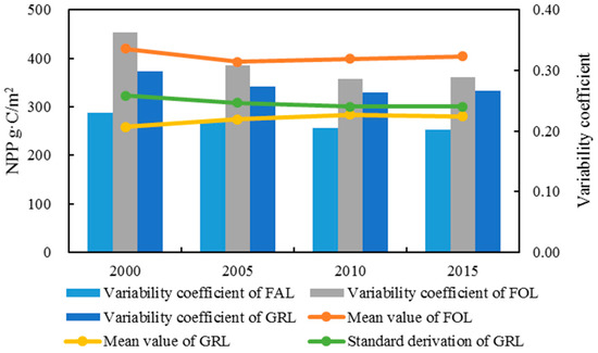 Mean value and variability coefficient of carbon sequestration in FAL, FOL and GRL in 2000–2015.