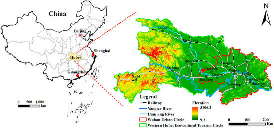 Hubei Province is located in the middle reaches of the Yangtze River in Central China (29°05′–33°20′ N and 108°21′–116°07′ E) with an area of 185,900 km2 and a varied topography (higher in the west and east and lower in the middle) consisting of mountains, hills, basins and plains, etc. The western part of Hubei Province is a high-elevation mountain area and the northeast and southeast part are hilly areas. In the middle part is the flat Jianghan Plain (i.e., the alluvial area of Yangtze River and Han River), which is an important food production area (Figure 1). In 2015, Hubei Province’s GDP was 2955.02 billion RMB with the population of 58.52 million, as well as the urbanization rate 56.7%. According to the Development Strategy of Two Circles and One Zone proposed by the Hubei Provincial Government in 2010 to realize integrated and sustainable development, Hubei Province is partitioned into Wuhan Urban Circle (WUC) and Western Hubei Eco-cultural Tourism Circle (WHETC). WUC is the important advanced manufacturing and high-tech industrial base, modern servicing center and integrated transportation hub in China. WHETC is the ecological green-shelter of the Central and Southern China and the water supply resource of the middle route of the South-to-North Water Transfer Project. In 2015, the area, population and GDP accounted for 31%, 53%, 60% in WUC and 69%, 47%, 40% in WHETC respectively.
