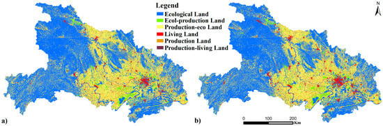 Spatial pattern of ecological-living-production land in Hubei Province. (a) 2009; (b) 2014.