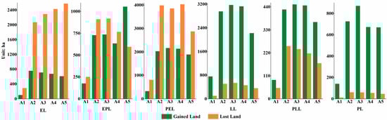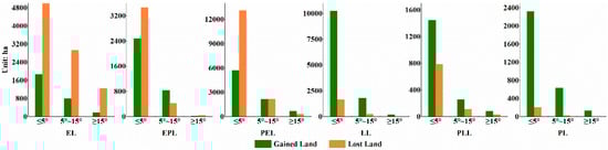 According to the effect of terrain aspect on soil moisture and sunlight, the terrain aspect is divided into five categories: flat side, sunnyside, semi-sunnyside, shadyside and semi-shadyside [37]. The production and living conditions in the area of sunnyside and semi-sunnyside are better than that in the area of shadyside and semi-shadyside. As shown in Figure 4, the lost land of EL mainly occurred in the shadyside while that of PEL and EPL mainly occurred in the sunnyside. The gained land of LL, PLL and PL in the area of sunnyside was more than that in the area of shadyside. It should be noted that a large amount of land with the ecological function was occupied by the land with living and production function in the areas with better natural conditions, which has adverse effects on ecological and food security.