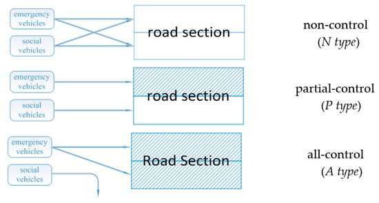 As shown in Figure 2, we designed three basic control types: non-control (N type), partial-control (P type) and all-control (A type) which are based on different regulation intensities. Partial control means that whereas emergency vehicles use the dedicated lanes, social vehicles can only use the rest of the lanes, to reduce the negative effects brought by the control strategy. In terms of the control intensity, the A type has the greatest influence on social vehicles, the P type takes second place and the N type is the least influential. Therefore, from the perspective of reducing the social impact, the A type should be restrictively used.