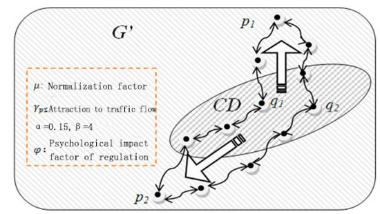 In Equation (10), parameter is the traffic capacity of node p and where refers to the traffic capacity of road section <p, p’>. Parameters are the current traffic flows of the two nodes, and we have and . Nb(.) is a set of the node’s direct neighbors, parameters and are separately the length of the shortest path between node p and q and the relevant layers, respectively. If these two nodes are direct neighbors, we have . Formula (10) shows that the attraction of node p in area G′ to node q in area CD is in inverse proportion to their squared distance. The larger the current traffic flow of node p is, the smaller the attraction to q will be. Similarly, the larger the current traffic flow of node q is, the larger the attraction of node p to q will be. Parameter is the normalization factor that is used to adjust the values in (0,1) of