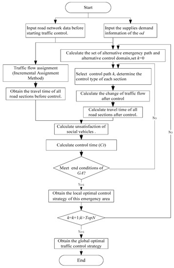 Other literature focused on traffic control schemes under different scenarios. Papageorgiou et al. [9] described all available traffic control schemes and their effects in an urban road network, high-speed road network and route guidance system. Lee [10] argued that different traffic regulations would produce different traffic behaviors and used performance areas corresponding to specific roads. From low to high impact, these areas are roadway line control and no control, direction control, limited direction control, central separation and speed control, artery line control, and access control. Iida et al. [11] took the Japan Hanshin-Awaji Earthquake in 1995 as their background and noted the importance of traffic control implementation after the quake. They also provided the rules for different types of vehicles to come into and depart from the disaster area. Using a dynamic traffic simulation model, Oshima et al. [12] reproduced Tokyo’s traffic congestion after the Great East Japan Earthquake in 2011. A traffic control scheme was proposed and its effectiveness was analyzed. Shimada et al. [13] proposed a two-stage regional traffic control scheme for the post-disaster network, and they thought that ITS (Intelligent Transport System) technology could more effectively manage the traffic flow after a disaster. In light of the natural disasters caused by rainstorms, Yamada et al. [14] used an RBFN (Radial Basis Function Network) network to design the traffic control scheme and analyze when to stop traffic regulations after the rain. Given road damage after an earthquake, Feng and Wen [15] proposed a fuzzy multi-objective programming algorithm and used a traffic control scheme to control vehicles entering and leaving the disaster area. Wen [16] also considered meeting the demands of disaster relief and the public. As a goal, a multi-objective traffic control scheme model was established based on the theory of bi-level programming methods and network optimization, and a fuzzy interactive algorithm and genetic algorithm were used to find the solution. Liu et al. [17] proposed a model reference adaptive control (MRAC) framework to conduct real-time traffic management during a post-disaster emergency evacuation to dynamically control the traffic flow and reduce casualties and property losses. In consideration of the demands of emergency responders after accidents, Konstantinidou et al. [18] studied the joint planning problem of emergency evacuation and emergency traffic management. They established a two-stage optimization model and proposed a lane reversal method to improve the network performance. Lastly, Chiou and Lai [19] built an integrated multi-objective optimization model to solve the problems of the relief path in an uncertain post-disaster environment and traffic-control-scheme optimization.