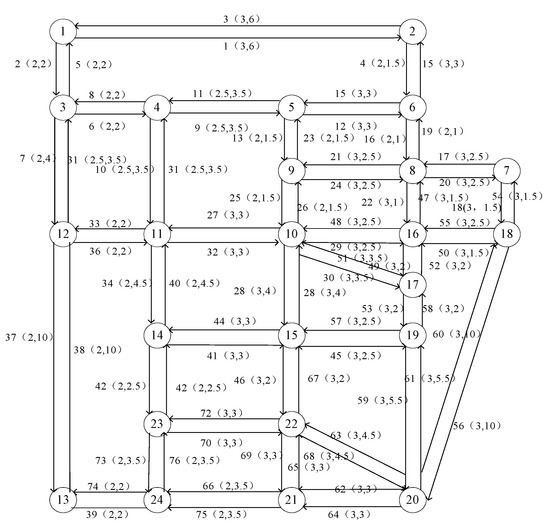 We take the Sioux-Fall road network in the American Northridge Earthquake in 1994 [22] and Flintbury City’s (a city in America) road network as examples. Sioux-Fall is a small network with 24 nodes and 76 road sections as shown in Figure 6. Flintbury is a large network with 1740 nodes and 2365 road sections (including bi-directional and one-way road sections). In this paper we mainly focus on the elaboration of the Sioux-Fall experiment, but we also present the results of the Flintbury experiment.