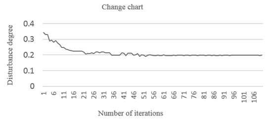 The algorithm parameters and control strategy are shown in Table 4. The last column in the table shows the control types of the road sections on an emergency path. As the partial-control type increases, social vehicles can still drive on parts of road sections, and road utilization can be effectively guaranteed, which directly causes the traffic flow spillover in control areas and greatly reduces the disturbance degree. After 50 iterations, the current optimal strategy can be obtained: its disturbance degree is the smallest (0.19804), and the emergency vehicles’ traffic time (25.97675) also meets the demand. Without the partial-control type, excessive all-control types will seriously change the road network’s structure. As a result, the traffic flow will be greatly reduced and the traffic flow spillover will increase considerably. Thus, the diverging domain will receive an excessive traffic flow increase, which will seriously affect the traffic of social vehicles.