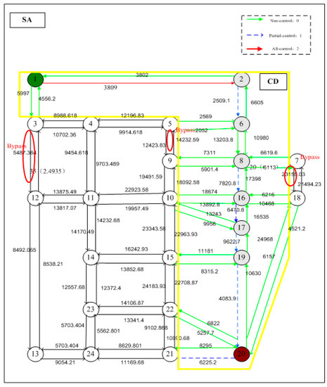 - In the diverging domain G′, because all of the nodes have an attraction to the traffic flow in control area CD, the traffic flow on will increase. Based on Equation (9) and Equation (11), we have