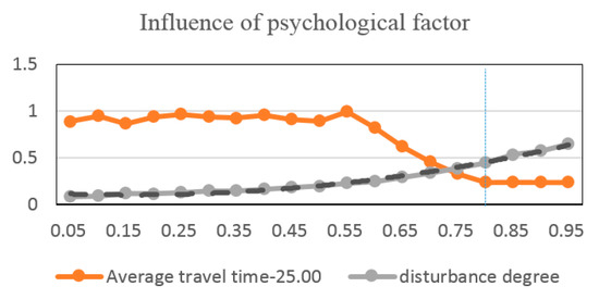 The promotion method and strength before starting the control and people’s social responsibility are reflected in the control strategy optimization process, as they are the effects of the psychological impact factor. When the other factors are unchanged, this experiment sets the intensity of the partial-control as 0.50, and the psychological factor takes values of 0.25–0.95 in turn. After repeating Experiment 1, we obtained the results shown in Table 6. As shown in the table, with the increase in the psychological factor, the disturbance degree increases and the average travel time of emergency vehicles decrease synchronously under fixed control intensity.