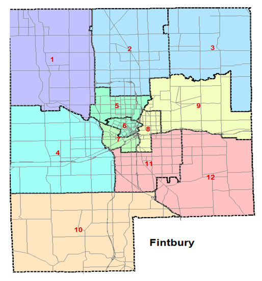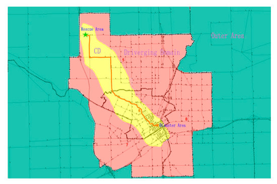 This experiment takes the example of the actual road network structure of Flintbury City in the United States. Based on the principle of district division, the entire road network is divided into 12 districts (named TAZ, Traffic Analysis Zone), shown in Figure 11. When a disaster occurs in TAZ 6, supplies need to be transported to this area (shown in Figure 12). The red pentacle represents the disaster area and the green pentacle represents the rescue area. Supplies are transported from the rescue spot to the disaster spot, and the red solid line represents the alternative rescue route. The control domain is defined based on the rescue route, i.e., the yellow area. The remaining areas (5, 6, 7 and 8) are the diverging domain and the area outside of the diverging domain is the outer area.