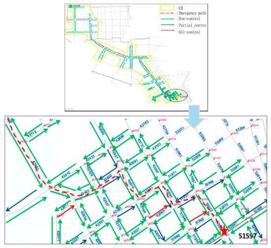 Based on the road network structure characteristics of this experiment the control domain consists of emergency road sections, emergency nodes, and other road sections/nodes connected with them in two layers. The optimal regulation strategy is shown in Figure 13, in which the red road sections are under full control, blue sections are under partial control (control intensity equals 0.50) and green sections have no controls. Details of the control types of the road sections in the optimal schema are shown in Table 7.