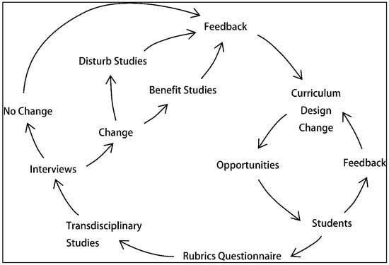 The curriculum design used to include a well-defined problem or set of problems within given areas for which students had to gather related information and use the natural or artificial advantages of the sites to solve the problems [21,24,25,26]. This curriculum design is a typical problem-oriented approach where students focused on understanding, defining, and solving problems [27]. During the curriculum restructure, the semester schedule of the curriculum was unchanged, but the curriculum design was altered. Instead of providing clearly defined problems for given areas, students were only provided a clearly defined area. Through their site visits and use of tools they had, such as sketch books, video recorder, cameras, and their five senses, students gathered the information required to define problems and analyze site conditions to create potential solutions. Students were questioned each week in terms of their observations, analyses, and solutions to provide guidance on the importance of knowledge of different disciplines. What students learned on site was beyond what had been taught in their departments, such planning and design theories and practices, and multiple-dimension issues, often intertwined, involving social, economic, and environmental considerations. As a result, students were encouraged to provide solutions in class rather than being criticized, considering their knowledge system had not yet been fully built. Asking for a complete solution for the defined problems would be unrealistic. This was a major change in the project design to encourage students to provide creative solutions rather than examining the workability of their solutions. That is to say, this change allowed students room for mistakes. The curriculum design was influenced by the solution-oriented approach defined by Kruger and Cross, but allowed solutions to be less practical. From this observation, the curriculum design was somewhat influenced by solution-based thinking that focused on methods to solve problems rather than tracing the roots of the problems [28,29]. The combination of thinking in the curriculum design, with learning by doing and learning with doing approaches, changed the traditional process of teaching and learning in Taiwan’s planning and design program. Thus, the extent to which studying other disciplines could enrich and provide feedback to the planning and design knowledge and practices was therefore the center of this research, as shown in Figure 2.