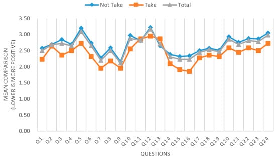 Using the statistics results obtained with the SPSS software, Figure 4 presents the mean comparison between students who took transdisciplinary modules and those who did not. The former tended to believe they were more confident in communicative skills (Question 6 (Q6–Q9)) and data collection and analysis (Q14–Q16) compared to the latter. In terms of computing skills (Q10–Q13), two groups of students performed similarly without significant differences. An explanation for this finding is that 10 of the 22 students who took transdisciplinary modules chose computer software modules, especially in geographic information system and computer-aid drawing. The former group of students tended to agree that they were more interested in planning and design professions and would like to have a career in these fields after graduation (Q17–Q24).