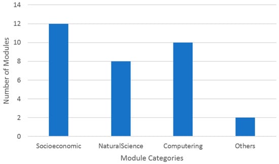 Figure 5 presents the number of transdisciplinary modules that students chose in socioeconomic, natural science, computing, and other disciplines. These 22 students took a total of 75 transdisciplinary modules and were all in the top 10 in both their class annual transcript ranking and the practical module according to their transcripts and tutors’ scoring records. Thus, these 22 students, along with 22 students who did not take transdisciplinary modules, were further interviewed and the results are presented in the next section.