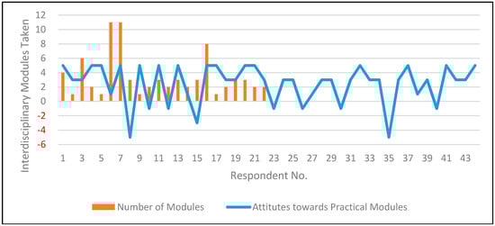 Various attitudes toward the practical modules were found amongst both groups of students who took and those who did not take transdisciplinary modules, as shown in Figure 6. According to the interview results, the rationale for not taking transdisciplinary modules was concentrated in three areas: the student did not yet know their life goals, the students already felt too much pressure in studying, and a lack of motivation for studying. The majority of respondents in this group maintained positive attitudes toward the practical modules. However, the results were interesting when they were compared to the other group.