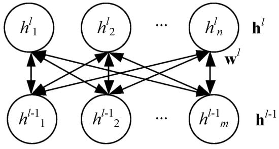 As introduced above, a DRBM is a stack of restricted Boltzmann machines (RBMs). After an RBM (Figure 2) has been learned, the activities of its hidden units can be used as the data for learning a higher-level RBM. Note that when l = 1, h° = x (also called visible nodes v in RBM).