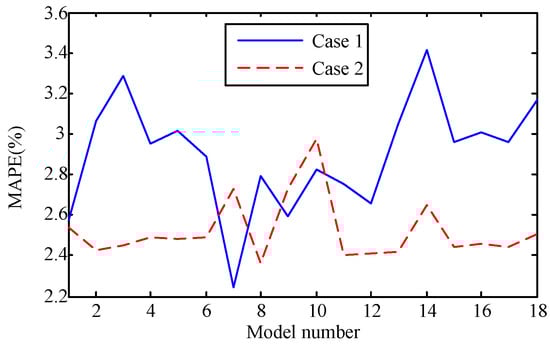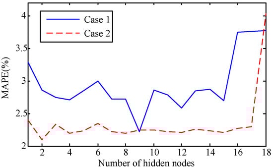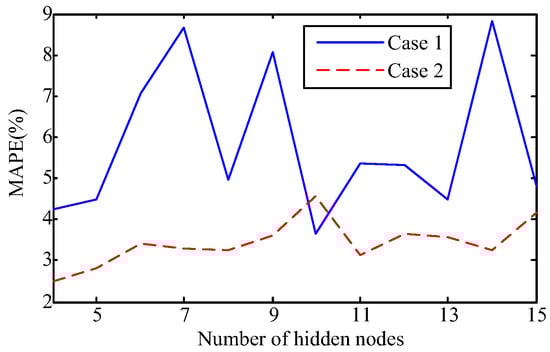 Figure 5 plots the MAPE using the FFNN with different hidden nodes of two cases, respectively. As shown in Figure 5, the hidden nodes with the lowest MAPE are 10 (Case 1) and 4 (Case 2) respectively, regarding the control models based on the multiple comparison procedures [31]. Through carrying out the paired t-test, one can choose the simplest model’s structure that is not significantly different from the control model so as to obtain better generalization ability. Table 3 gives the results of the paired t-test at the confidence level of 5%. Note that the models in Table 3 are remarked as the hidden nodes.
