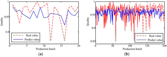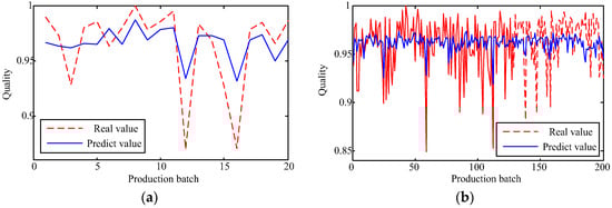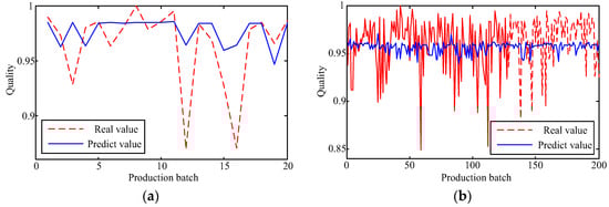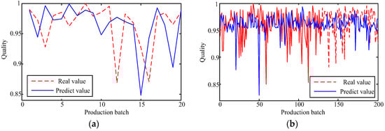 The data is collected from a competition about manufacturing quality control in the Tianchi Data Lab of China (https://tianchi.aliyun.com/competition/gameList.htm). They have the same technique parameters (19 process parameters as shown in Table 1) with a different setting, thus the quality index (one key-quality index with range [0, 1] as shown in Figure 4) exhibits diversity in different batches. There are two kinds of samples, one is a small sample including 100 batches (total sample (19 + 1) × 100, as shown in Figure 4a), and the other is a big sample including 1000 batches (total sample (19 + 1) × 1000, Figure 4b). These data are divided into two categories, 80% for training and 20% for testing. Note that all the data have been desensitized.