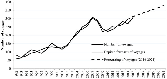 By estimating the regression function for (1) numbers of excursions to Antarctica, and (2) numbers of visitors, on the basis of explanatory variable forecasts (GDP per capita for the U.K., U.S., and German economies), a smoothed forecast of the development of tourist traffic in the region was achieved (Figure 4). This shows that if the current economic growth trend in the U.K., U.S., and Germany continues, the number of organized excursions in the next five years will reach around 376 per year (in 2021) (R2 = 0.9647), and the number of visitors to the region per year will reach around 36,600 in the year 2021 (R2 = 0.9593).