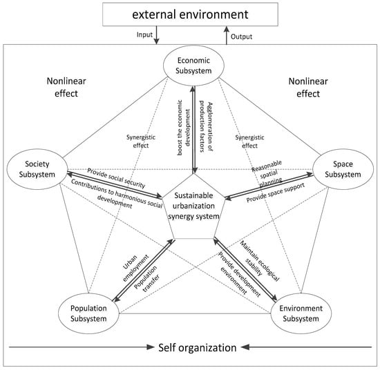 Synergetics was founded in 1976 by the German theoretical physicist Professor Hermann Haken, and its basic idea is that each subsystem in the living and nonliving open system will generate synergetic effects through nonlinear interactions under certain conditions, which makes the old structure develop into a new ordered structural system that has undergone fundamental changes in time, space, nature, and function. Sustainable urbanization is an open and nonlinear complex system that encompasses society, economy, environment and other aspects [11,12] and its development process is a self-organizing system. Healthy and orderly urban development requires each element within the system to coordinate with and compete with each other, which was the driving force for the overall evolution of the sustainable urbanization system. Through this drive, the system will gradually reach an orderly state and develop in a specific direction. Therefore, the complex evolution of SUSS can be well analyzed by synergistic theory.