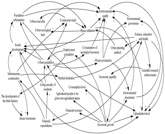 The construction of an effective synergistic measurement index system, therefore, is essential to accurately assess the synergy degree, which means that appropriate order parameters (indicators that reflect the evolutionary trends and urbanization characteristics) need to be identified and selected for each subsystem. According to synergy theory, variables that determine the system are called order parameters. The order parameter is generated by a single subsystem, which in turn dominates the behavior of each subsystem, reflecting the evolutionary trend of subsystems and composite system. From the analysis of the many factors affecting sustainable urbanization and following the principles of science, systematicness, operability, availability, and representativeness, a diagram of the relationships between influence factors of sustainable urbanization was constructed, as shown in Figure 2.
