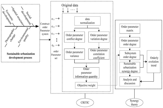 The evaluation of urban development quality and the exploration of evolutionary trends of sustainable urbanization can be helpful in rational collaborative planning of urbanization [14]. To effectively measure the sustainable urbanization situation, and ensure the coordinated and orderly operation of a sustainable urbanization composite system, in this paper, synergetic theory and the CRITIC method are introduced to allow for the measurement of sustainable urbanization and ensure the sustainable urbanization composite system is coordinated and orderly. The main processes in this study are as follows. First, an order parameter system for the sustainable urbanization synergy system is developed based on previous research results, after which, a quantitative analysis model is established based on synergetic theory. The subsystem order degree and composite system synergy degree are then analyzed to study the degree of sustainable urbanization within the system.
