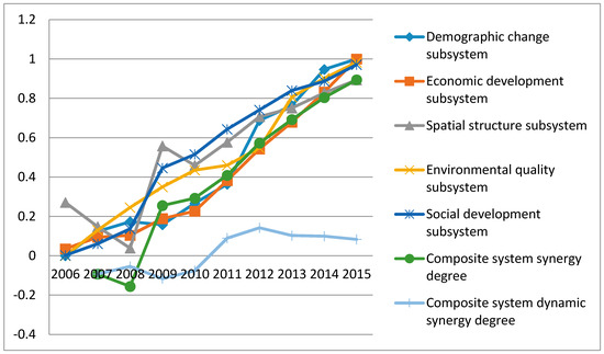 From a comparison of and , the improvement of the synergy degrees of the sustainable urbanization composite system from 2006 to 2011 and from 2010 to 2015 can be observed. suggests that the composite system was in a synergistic development state in these two stages, but the progress of the synergy degrees from 2010 to 2015 is greater than that from 2006 to 2011. The main reason was that in 2011, the beginning of the 12th Five-Year Plan, Henan first introduced a series of policies focused on the scientific coordination development road of the new urbanization, and explored out a sustainable urbanization road. Consequently, it can be seen from Figure 4 that the order degree improvement trend of all of the subsystems is more obvious from 2011.
