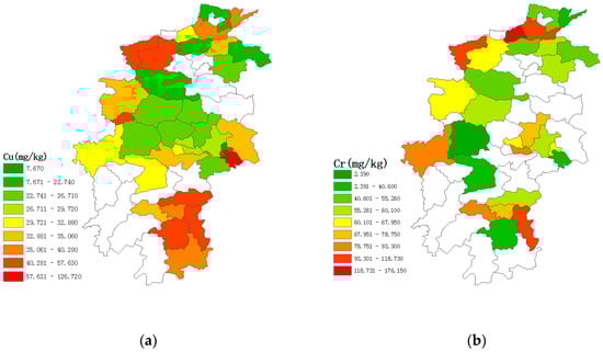 Spatial distribution of Cu (a), Cr (b), Cd (c), Zn (d), Pb (e), Hg (f) and As (g) in soils from Central China.