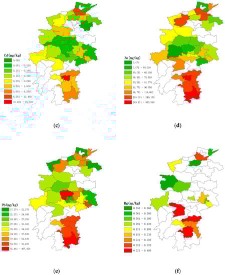 Basic descriptive statistics were derived to provide a summary of the concentration of soil metals in Central China, shown in Table 1 and Table 4. The mean concentrations of all toxic metals exceeded their corresponding background values (BVs), especially for Cd, Pb and Hg, which were about 13.48, 1.71 and 2.92 times greater than their BVs, respectively. According to the current Chinese Environmental Quality Standard for Soils (GB 15618-1995), Class I was developed to protect the natural ecology of the region and to maintain the natural background of the soil quality, Class II was developed to protect agricultural production and corresponding human health, and Class III was developed to ensure the normal growth of agriculture, forestry and plants [127]. The results showed that the mean concentrations of all soil metals were lower than their corresponding class II values, except Cd, which was 2.18 times greater than its corresponding class II value. Specifically, the mean concentrations of all toxic metals in three provinces surpassed their corresponding BVs, except Cr in Hubei Province and As in Henan Province. The mean concentrations of all soil metals in the three provinces were within their corresponding class II values, except Cd, which accounted for the whole situation in Central China.