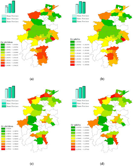 For non-carcinogenic risk, the total HIs of studied metals for children in Central China were 1.10 (Hubei), 1.41 (Hunan), 0.852 (Henan), respectively, and the total HIs for adults were 0.158 (Hubei), 0.202 (Hunan), 0.122 (Henan), respectively. It was obviously that the children in Hubei and Hunan Province faced non-carcinogenic risks, in contrast with the children in Henan and the adults in Central China. The HQ of each toxic metal for children and adults in Central China decreased in the order of As > Cr > Pb > Cd > Cu/Hg/Zn. Cr, Pb and As caused relatively higher non-carcinogenic risks to possible receptors than the other four toxic metals. For instance, the HQ of As (0.564), Cr (0.365) and Pb (0.14) accounted for 51.31%, 33.19%, and 12.71% of the entire HI value for children in Hubei, respectively. HIs for the studied metals in Central China were higher for children than for adults [128]. In particular, the HQs for children through ingestion were averaged at 7.14 times higher than those for adults, with dermal contact 4.92 times higher and inhalation 1.36 times higher [27]. The HQ of the three exposure pathways for both children and adults in Central China decreased in the following order: ingestion > dermal contact > inhalation, which was similar to other reports [121,129,130].
