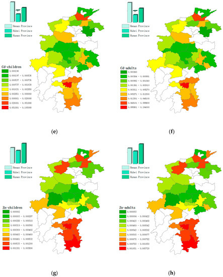 After investigating the spatial distribution and geoaccumulation indexes of the studied metals, a health risk assessment for children and adults from exposure to soil metals in Central China through possible exposure pathways was calculated using Equations (2)–(6), and the results are shown in Table 5 and Table 6 and Figure 4 and Figure 5.