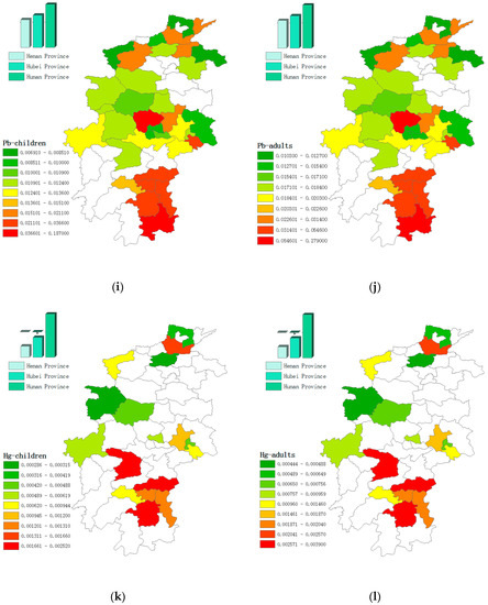 Non-carcinogenic hazard indices of Cu, Cr, Cd, Zn, Pb, Hg and As for children (a,c,e,g,i,k,m) and adults (b,d,f,h,j,l,n) in soils from Central China.
