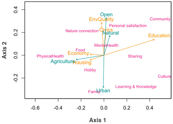 Fresh organic food production was stated as the primary benefit of urban gardening (58%) and, unsurprisingly, this was consistent across counties and gardeners as the primary activity of an urban garden. The importance of food for all gardeners in this system is clearly evidenced by food’s location in the middle of the ordination plot (Figure 2) and furthers the argument that community gardening can increase fruit and vegetable provision [25,26]. However, a number of other notable benefits were highlighted such as mental health, connection to nature, family, and physical health. Many of these benefits relate to and are being investigated within the current research on the benefits of urban green space [7,57]. Thus, gardeners do not only identify their time in the garden as a time for food production, but they report a variety of ways in which they gain additional benefits. This is evident in the multifaceted ways in which gardeners perceive well-being improvement through their survey responses. Similar to community garden literature in other regions, the responses especially illuminate how these green spaces are important for social relations by facilitating interactions among family and friends [33,58], cultural heritage values by growing culturally significant food plants [59], and educational values by providing a space to share and teach agricultural knowledge [26,60].