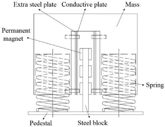 Compared to viscous damping, eddy current damping would be an alternative choice. Eddy current in the conductive plate is induced by the relative motion between the permanent magnet and the conductive plate [16,17]. The Lorentz force in the conductive plate will hinder the relative motion, and the vibration energy is dissipated by the heat of the conductive plate. Lu et al. [18] studied the improving performance of a super tall building using a new eddy current tuned mass damper (ECTMD). Bourquin et al. [19] introduced the magnetically tuned mass dampers for optimal vibration damping of large structures. Bae et al. [20] introduced the vibration suppression of a cantilever beam using eddy current damper. Sodano et al. [21,22,23] studied an active eddy current damper for vibration suppression of a beam. Amjadian et al. [24] introduced a passive electromagnetic eddy current friction damper through theoretical and analytical modeling. Maddah et al. [25] studied the reduction of magneto rheological dampers stiffness by incorporating an eddy current damper. Chen et al. [26] studied the robustness of ECTMD. Wang et al. [27] studied the vibration control of ECTMD on a submerged pipeline model.