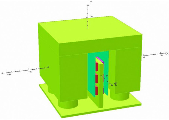 In Opera3D, the mass of adaptive-passive ECTMD is 20 kg, with the size being 200 mm in length, 200 mm in width and 175 mm in height. The frequency of this device is 2.0 Hz. The permeant magnet is composed of N35 (NdFeB) material, with its size being 40 mm in length, 20 mm in width and 5 mm in height. Material of the conductive plate is copper, and it is 180 mm in length and 110 mm in width. The finite element model of the adaptive–passive ECTMD is shown in Figure 2.