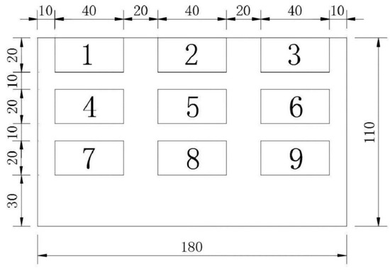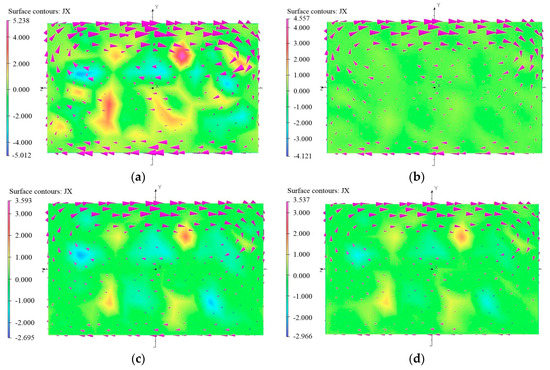 To further study the results in Table 2, the following evaluation indexes are defined [47]. If the sign of local magnetic induction intensity is the same as the average value, then this kind of local magnetic induction intensity is called “beneficial magnetic induction intensity” and this area is called “beneficial area”. Otherwise, they will be called “adverse magnetic induction intensity” and “adverse area”. From the average values in nine cases, it is clear that case 9 is the best; however, the distribution of magnetic induction intensity in the copper plate is also very important, and they are shown in Figure 4.