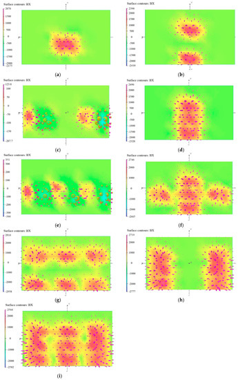 The distribution cloud pictures of magnetic induction intensity (Gauss). (a) Case 1; (b) Case 2; (c) Case 3; (d) Case 4; (e) Case 5; (f) Case 6; (g) Case 7; (h) Case 8; (i) Case 9.