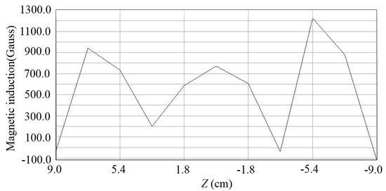 In Table 2, the average values of case 3 and case 5 are negative. As can be seen in Figure 4c,e, the adverse area is almost the same as the beneficial area; therefore, the resultant value is very small, which means that the magnetic induction intensity is small, leading to litter damping effects. The principle of how to choose the adsorption position of permanent magnets is to make the beneficial magnetic induction intensity far larger than the adverse magnetic induction intensity, and the beneficial area far larger than the adverse area. It can also be seen from Figure 4 that the area which the magnet is projected onto the copper plate has larger magnetic induction intensity than its surrounding area, and the magnetic induction intensity decreases sharply in surrounding areas. To illustrate more clearly, take case 9 as an example, the line distribution of magnetic induction intensity in the midline of long side direction is shown in Figure 5. It can be seen that the positions of three crests are the positions which the magnets are projected onto the copper plate, and in the surrounding areas; the magnetic induction intensity decreases sharply.