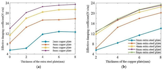 Effective damping coefficient as functions of the thickness of extra steel plates/copper plates using different copper plates/extra steel plates. (a) Using different copper plates; (b) Using different extra steel plates.