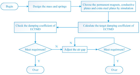 The design method flow chart of adaptive-passive ECTMD is shown in Figure 9. Firstly, a medium size ECTMD, e.g., 1000 kg mass and 2.0 Hz frequency is preliminary designed. Then, certain important parameters should be determined based on the parametric study introduced in Section 3, that is, the position of magnets, thickness of conductive plate and thickness of extra steel plate are set. At the same time, a fitting function (just as Equation (8)) has been obtained and the ECTMD has a damping ratio adjustment range. If the needed size of ECTMD is different from the preliminary one, the height of mass and springs can be changed to meet the requirement, and the damping ratio can be changed through adjusting the air gap easily. The damping ratio adjustment range can be expanded through expanding the notch which passes through the mass. Consequently, this design method of adaptive–passive ECTMD is easy to be implemented and has a great potential in engineering applications.
