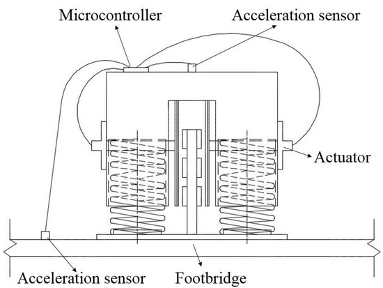 As for the semi-active ECTMD, there will be two acceleration sensors, one is put at the mass of ECTMD, and the other is put at the middle span of the footbridge. There will be an actuator behind the extra steel plate on both sides, which is controlled by a microcontroller. The microcontroller receives acceleration sensors’ signal and controls actuator in real-time. Therefore, the actuator can adjust the air gap between conductive plates and magnets in real-time through pushing and pulling the extra steel plate. In this way, the eddy current damper is adjusted in real-time. Schematic diagram of the semi-active ECTMD is shown in Figure 10.