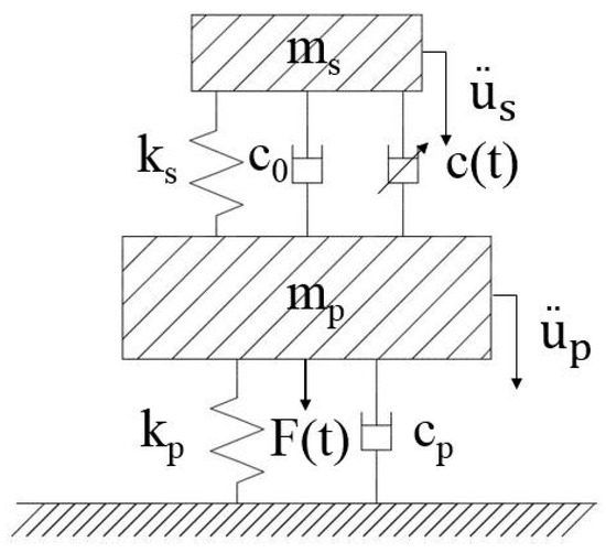where and are the mass of the primary system and semi-active ECTMD respectively. and are the viscous damping coefficient of the primary system and constant viscous damping coefficient of semi-active ECTMD respectively. and represent the stiffness coefficient of the primary system and semi-active ECTMD respectively. and mean the absolute displacement of the primary system and semi-active ECTMD respectively. means the variable viscous damping coefficient of semi-active ECTMD.