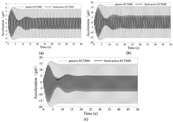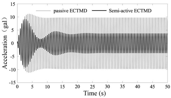 As can be seen from Figure 12, in steady state, compared to passive ECTMD, the semi-active ECTMD can decrease the structural peak acceleration to a great extent.