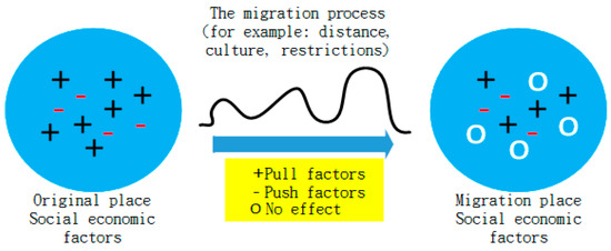 Ravenstein proposed “the laws of migration” in 1885 based on the migration situations in the Census of England and Wales and with reference to data from several countries. His view focused on illustrating the phenomenon of migration from rural to urban areas and held that the labor population of migration was mainly limited by both the push and pull effects [19]. A region’s push being greater than its pull will lead to migration of residents; conversely, a region’s pull being greater than its push will attract more residents (Figure 1). The push-pull theory indicates that the reason for population migration is the push of the origin place of residence, the pull of the migrated place, and the interaction of interferences and obstacles during the process. Migration behavior is caused due to the understanding of migrants towards an objective environment, coupled with the decision-making behavior formed through subjective feelings and judgments. Factors such as fertile land, pleasant climate, better living environment, adequate employment opportunities, better public facilities, education opportunities for children, social stability, and political stability may be incentives to attract more people to migrate. In addition, factors that hinder or interfere with the occurrence of migration or reduce the migration behavior are known as intermediate obstacles, including distance, immigration regulations, and personal factors.
